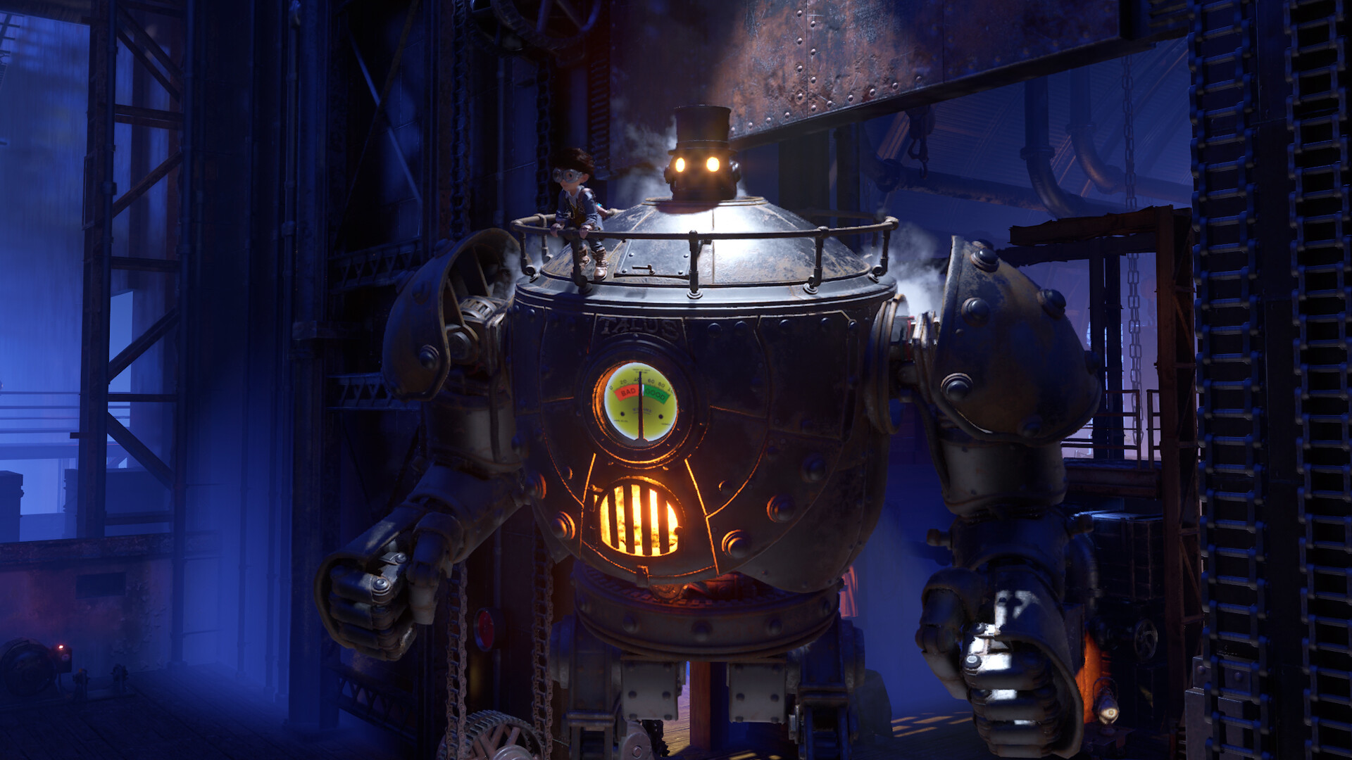 Tu familia ha sido capturada, y los Seres Desdichados han dejado claro que nadie saldrá con vida. Solo queda Talus, un robot gigante a vapor con sombrero de copa, y un pequeño ejército de células de energía de autómatas llamadas Embots. Montar sobre su hombro o dentro de su pecho hueco ofrece un lugar seguro donde esconderse, y sus poderosos brazos ofrecen una venganza aplastante contra aquellos que tanto os han arrebatado. Corretea por los pasillos, hangares y fábricas, reuniendo células de energía, carbón y agua para tu compañero, y luego guíalo a un lugar seguro; sois la última esperanza del otro.